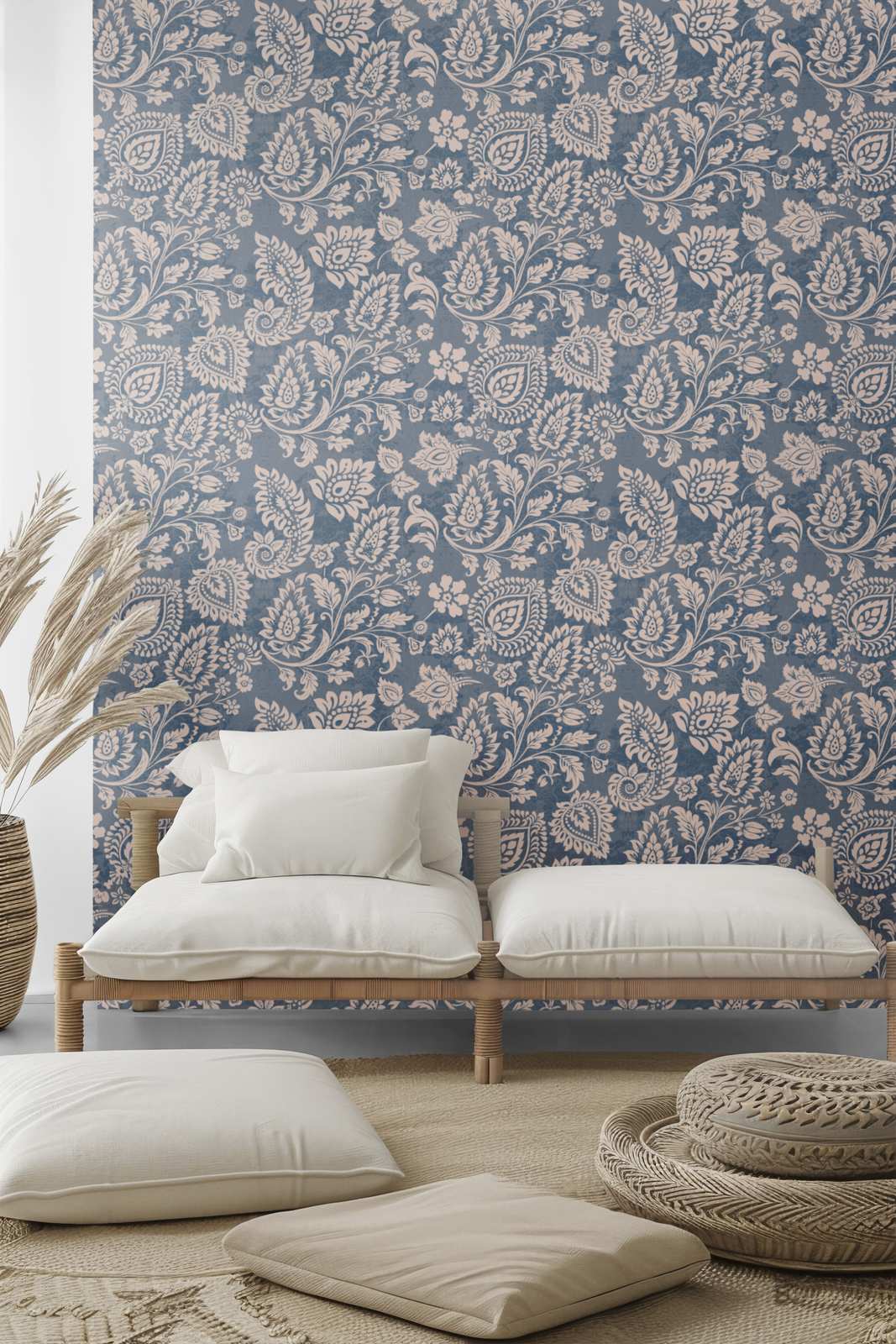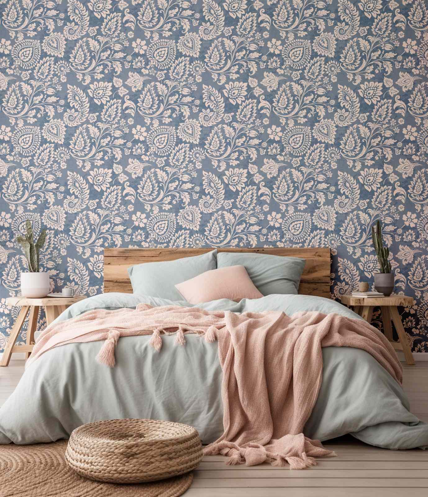 Transform your space with this stunning blue floral wall paper, perfect for adding a touch of elegance to any room. The intricate pattern draws inspiration from classic designs, making it both timeless and stylish. Ideal for a living room, bedroom, or dining area. This wall paper serves as a charming backdrop to enhance your home decor.