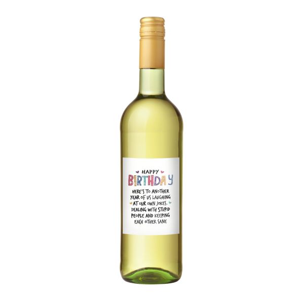 This bottle sticker is perfect for celebrating birthdays with a touch of humor. Featuring the text: 'HAPPY BIRTHDAY - Here's to another year of us laughing at our own jokes, dealing with stupid people, and keeping each other sane.' Ideal for wine bottle decoration.