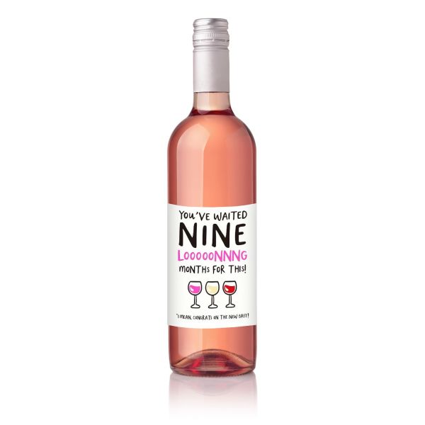 This bottle sticker features a humorous message for a new parent: "YOU'VE WAITED NINE LooooNNNG MONTHS FOR THIS!" along with colorful wine glass illustrations. It's a fun addition to celebrate a special occasion. The phrase "I MEAN, CONGRATS ON THE NEW BABY!" adds an extra touch. Perfect for a wine bottle.