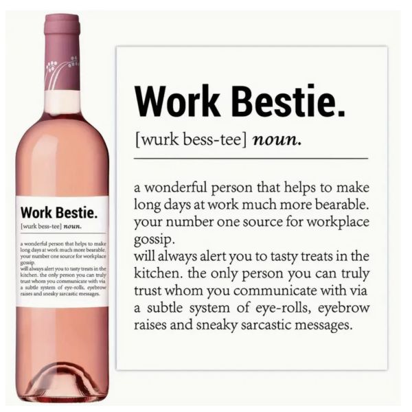 A perfect wine bottle sticker for your work best friend. 'Work Bestie' definition: a wonderful person that helps to make long days at work much more bearable. Your number one source for workplace gossip. Will always alert you to tasty treats in the kitchen. The only person you can truly trust whom you communicate with via a subtle system of eye-rolls, eyebrow raises and sneaky sarcastic messages.