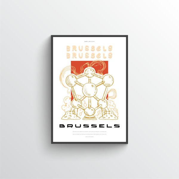 The Brussels Atomium poster features a stylish illustration of the iconic Atomium structure in Belgium. This poster is perfect for adding a touch of European charm to your home decor. Prominent text: BRUSSELS, BRUSSELS. Belgium. Product contains a single poster only.