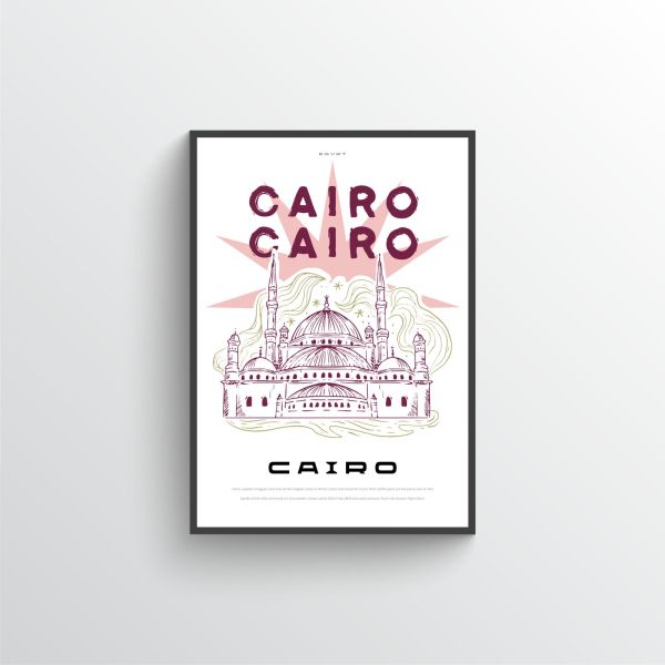Explore the beauty of Cairo with this stylish city poster. The poster features an artistic rendering of the iconic architecture of Cairo, including its famous mosque. Prominent text includes 'CAIRO'. Product contains a single poster only.