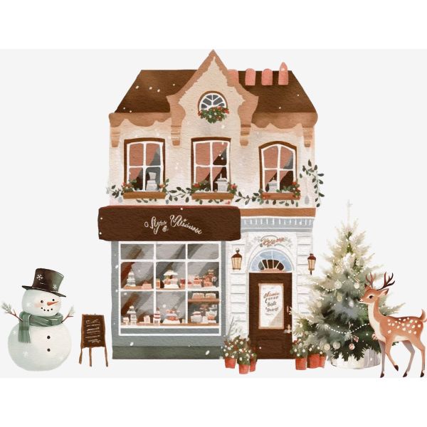 This delightful sticker features a charming illustration of a Christmas bakery, complete with festive decorations. Perfect for adding a touch of holiday spirit to any surface.