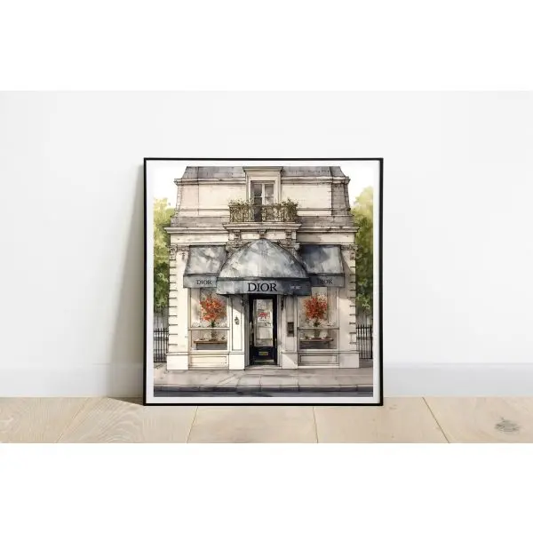 Capture the elegance of luxury retail with this Dior Storefront poster. Featuring a beautifully detailed illustration of the iconic boutique, it adds a touch of sophisticated flair to any room. The prominent 'DIOR' signage enhances its charm. Product contains a single poster only.