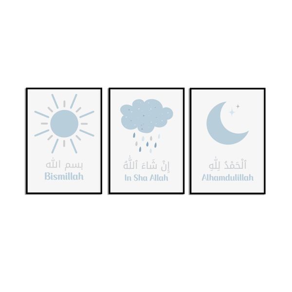 This beautiful wall poster set features three Islamic phrases: Bismillah, In Sha Allah, and Alhamdulillah, each accompanied by a minimalist icon. The soothing pastel colors and elegant design bring a touch of serenity to any room. Perfect for enhancing your home decor with spiritual elegance, this product contains a set of 3 posters only.