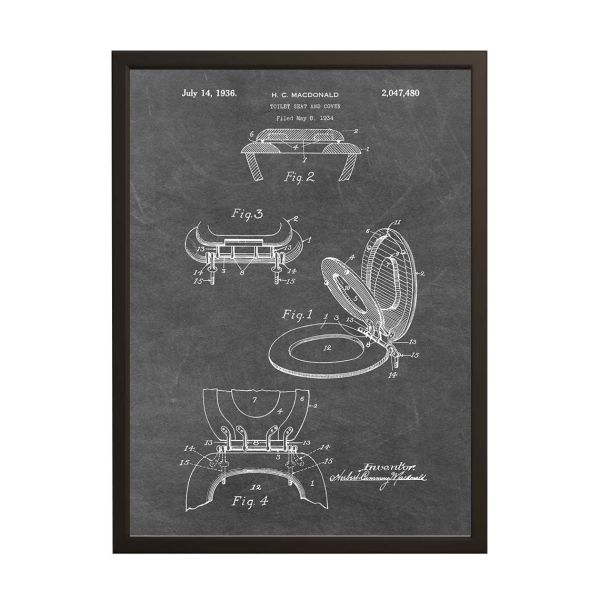 This patent drawing poster showcases the invention of a toilet seat and cover by H.C. Macdonald, filed on May 8, 1934. The design, dated July 14, 1936, is displayed in elegant detail with patent number 2,047,480. Available in various colours.