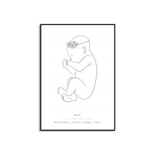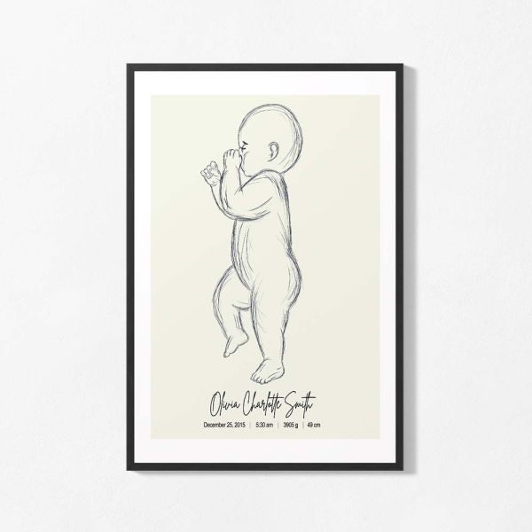 This personalised birth poster features a charming sketch of a baby, serving as a perfect keepsake for new parents. Text personalization options allow you to include the baby's name, birth date, time, weight, and height. Product is customisable and makes a lovely addition to nurseries or as a thoughtful gift for friends and family.