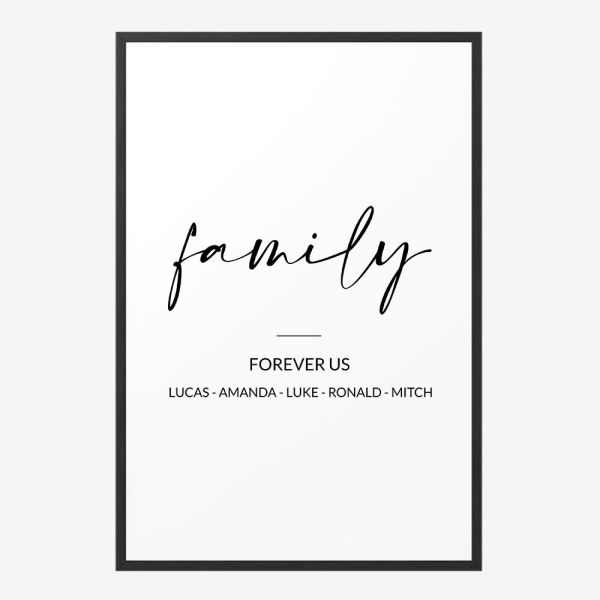 This personalised poster highlights the word 'family' with space to add names, creating a cherished family keepsake. The phrase 'FOREVER US' adds a timeless touch. Product is customisable and contains a single poster only.