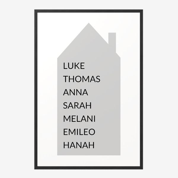 This personalised poster features a stylish house silhouette with customizable text elements, perfect for adding a personal touch to any room. The minimalist design emphasizes simplicity while allowing custom names to stand out. Product is customizable and contains a single poster only.
