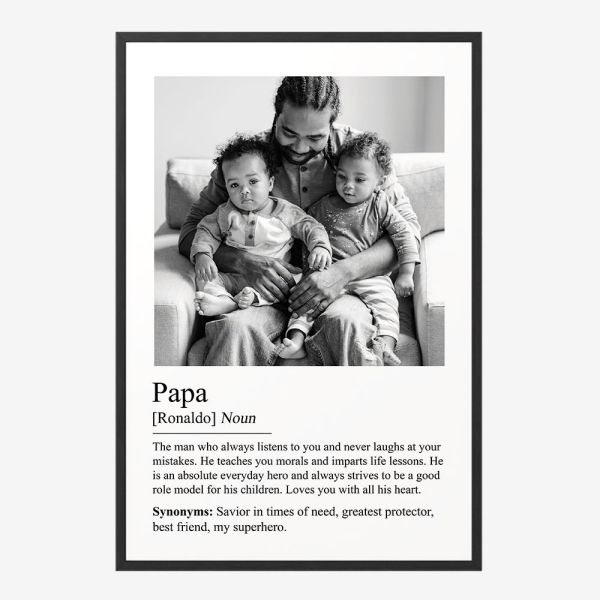 The personalised poster features a heartwarming image of a father with his children. Text reads: 'Papa [Ronaldo] Noun. The man who always listens to you and never laughs at your mistakes. He teaches you morals and imparts life lessons. He is an absolute everyday hero and always strives to be a good role model for his children. Loves you with all his heart. Synonyms: Savior in times of need, greatest protector, best friend, my superhero.' This product is customisable. Product contains a single poster only.