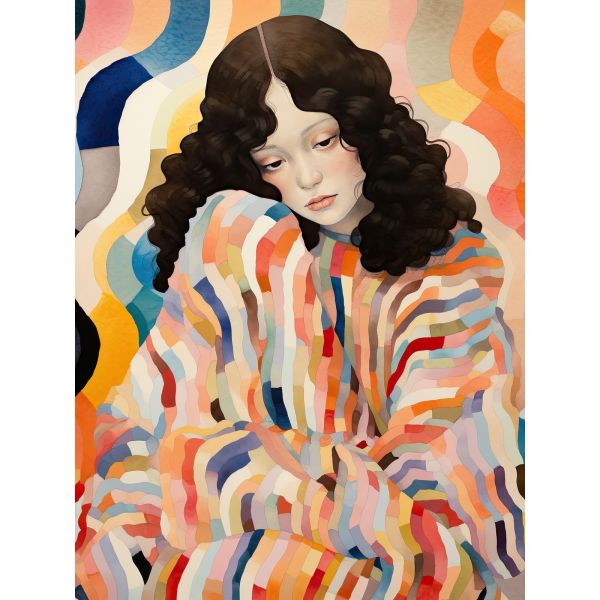 This poster features a stunning abstract art portrait with vibrant colors and intricate patterns, capturing a harmonious blend of curves and lines. Perfect for adding a touch of elegance to any space, it showcases beautiful artistry and design. Product contains a single poster only.