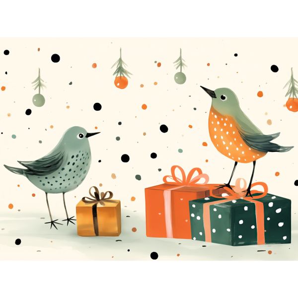 This charming poster features a delightful illustration of two birds surrounded by festive gifts and ornaments. It captures a whimsical and joyous scene perfect for any room decor. Product contains a single poster only.