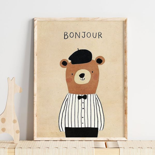 This charming poster features an adorable bear wearing a beret and bow tie with the word 'BONJOUR' above it. The simple yet stylish design adds a whimsical touch to any room. Perfect for children's rooms or as a playful accent in your living space. Product contains a single poster only.