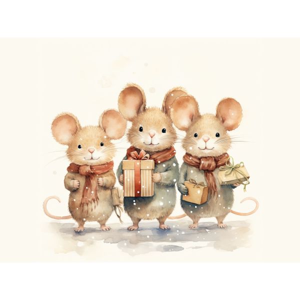This delightful poster features three cheerful mice clad in winter scarves, joyfully presenting gifts amidst falling snowflakes. Perfect for adding warmth and charm to any room, it captures the festive spirit with style and whimsy. This product contains a single poster only.