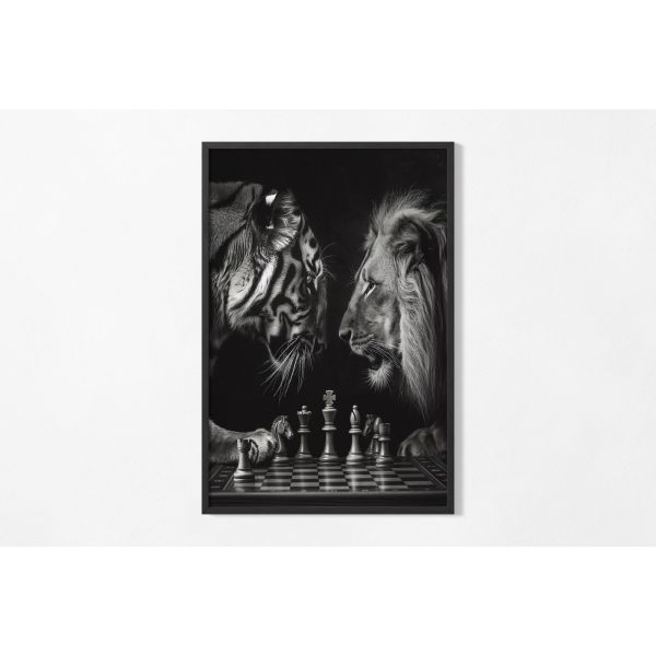 This stunning poster features a dramatic black and white depiction of a chess battle between a lion and a tiger. The unique artwork adds a touch of elegance and depth to any room. Perfect for chess enthusiasts and animal lovers alike, it captures the wild spirit of strategy. Product contains a single poster only.