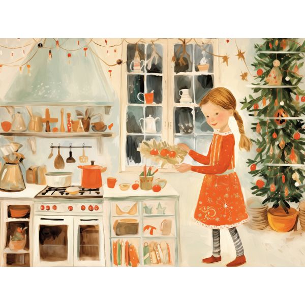 This charming poster captures a cozy Christmas kitchen scene with a young girl preparing a festive dish. The warm colors and delightful details bring holiday cheer to any space. Perfect for adding a touch of warmth and joy to your home. Contains a single poster only.