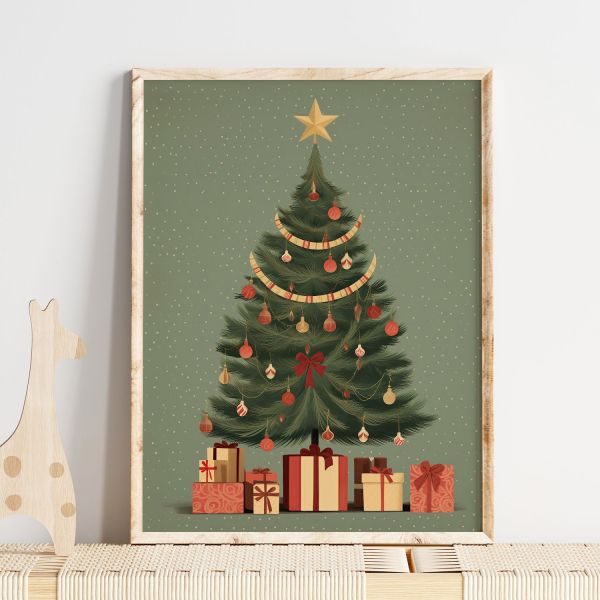 This poster beautifully captures a decorated Christmas tree surrounded by wrapped gifts, set against a soft green background adorned with subtle dots. Perfect for adding a festive touch to your home during the holiday season. Product contains a single poster only.