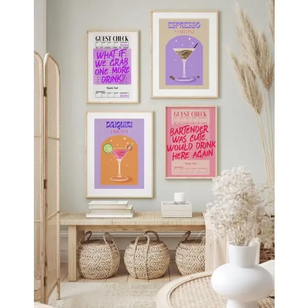 This vibrant poster set features four unique designs with delightful cocktail themes, jazzing up any space with a humorous twist. Perfect for home bars or kitchens, these posters read: 'What if we grab one more drink?', 'Espresso Martini', 'Bartender was cute, would drink here again', and 'Daiquiri Dream'. Product contains a set of 4 posters only.