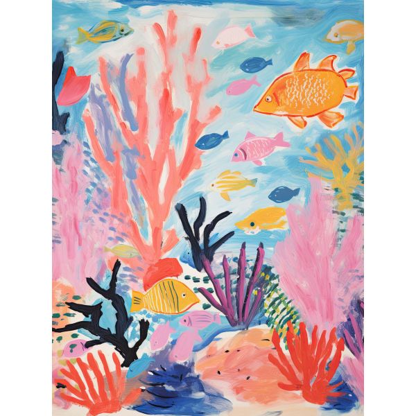 Brighten your space with this vibrant poster depicting a colorful coral reef teeming with life. The artwork captures the vivid hues and dynamic compositions of underwater scenes. Perfect for adding a splash of color to any room. Product contains a single poster only.