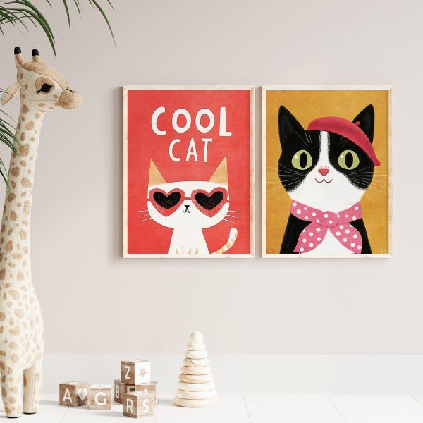 These charming posters feature adorable cats with quirky styles. One poster showcases a cat in heart-shaped sunglasses with the text 'COOL CAT'. The other poster presents a cat in a red beret and polka dot scarf. Perfect for adding a playful touch to any space, this product contains a set of 2 posters only.