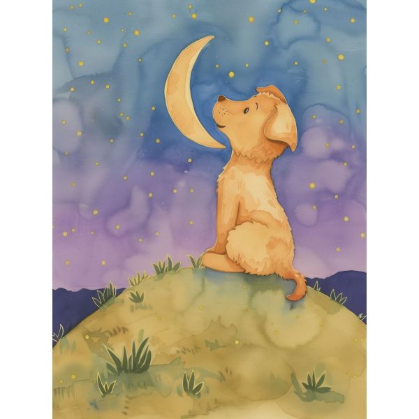 This charming poster features a delightful illustration of a dog gazing at a crescent moon amidst a starry night sky. Perfect for adding a whimsical touch to any space, this artwork captivates with its warm colors and playful theme. Product contains a single poster only.