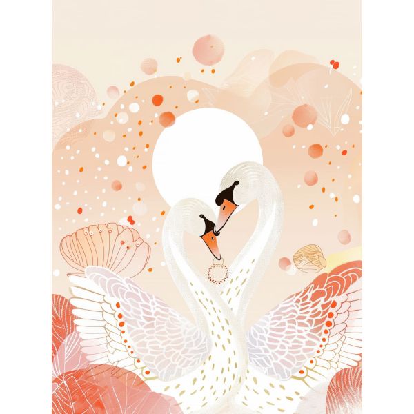 This beautiful poster features an elegant illustration of two swans surrounded by a dreamy setting. The artwork captures a serene and graceful scene of nature. Perfect for adding a touch of elegance to any room, this poster contains a single poster only.