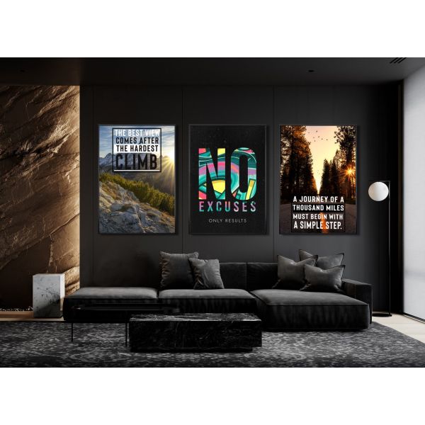 Enhance your living space with this set of motivational quote posters. Featuring phrases like 'The best view comes after the hardest climb', 'No excuses, only results', and 'A journey of a thousand miles must begin with a simple step', these posters act as a daily source of inspiration. Perfect for any room, their striking design complements both modern and traditional decor. Product contains a set of 3 posters only.