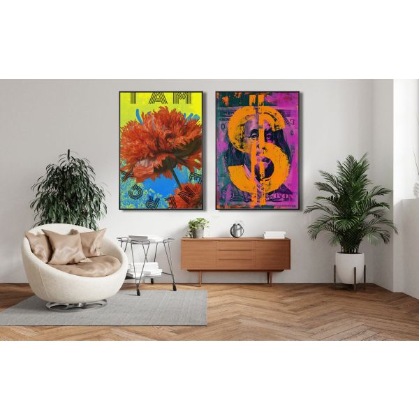 Enhance your space with this vibrant set of pop art posters featuring a bold floral design and a striking dollar sign motif. The vivid colors and modern style make them perfect conversation starters in any room. This product contains a set of 2 posters only.