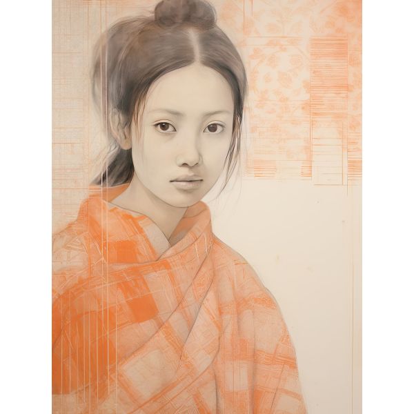 This elegant poster features a captivating portrait of a young woman in an orange robe. Her serene expression and delicate features make this artwork a beautiful addition to any space. Product contains a single poster only.