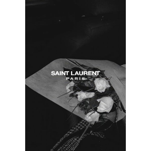 Elegant black and white poster featuring the text 'Saint Laurent Paris' with a sophisticated floral arrangement. Ideal for adding a touch of luxury to any room decor. Product contains a single poster only.