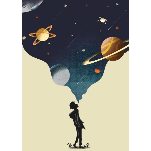 This captivating poster illustrates a dreamy scene of a child gazing at the vastness of space, filled with planets and stars. Perfect for inspiring imagination, it adds a whimsical touch to any room. Product contains a single poster only.