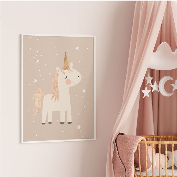 This adorable unicorn poster adds a touch of magic to any nursery or child's room with its whimsical illustration. Featuring a charming unicorn surrounded by stars, this poster is perfect for inspiring a love for fantasy. Product contains a single poster only.