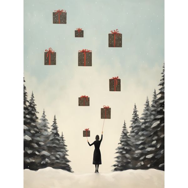 This poster beautifully captures a winter scene with a figure holding gift-wrapped presents against a snowy backdrop. Perfect for bringing festive cheer to your decor. Product contains a single poster only.