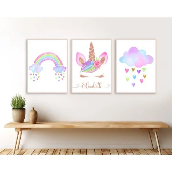 Posters - Golden Unicorn and Hearts / Personalised / Set of 3