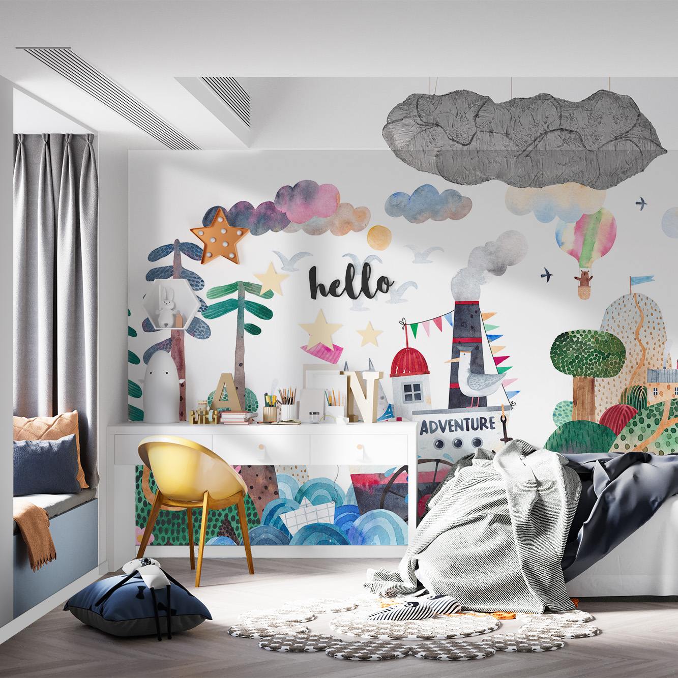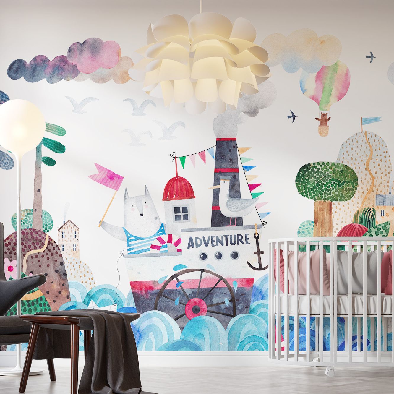Bring the excitement of exploration to your home with this vibrant wall paper featuring an adventure ship amidst colorful waves and landscapes. The whimsical design includes details like seagulls, trees, and a hot air balloon. Perfect for a child's room or any playful space, it will spark imagination and joy.