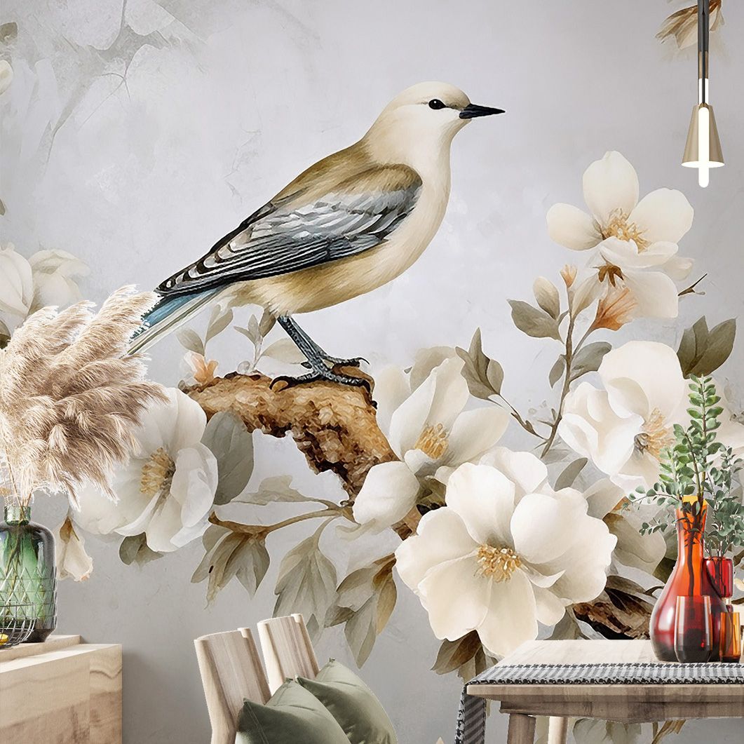 Enhance your home decor with this elegant wall paper featuring a serene bird perched among delicate blossoms. Perfect for creating a tranquil atmosphere in any room. This wall paper exudes a soft, artistic elegance that complements various interior styles. Keywords: wall paper.