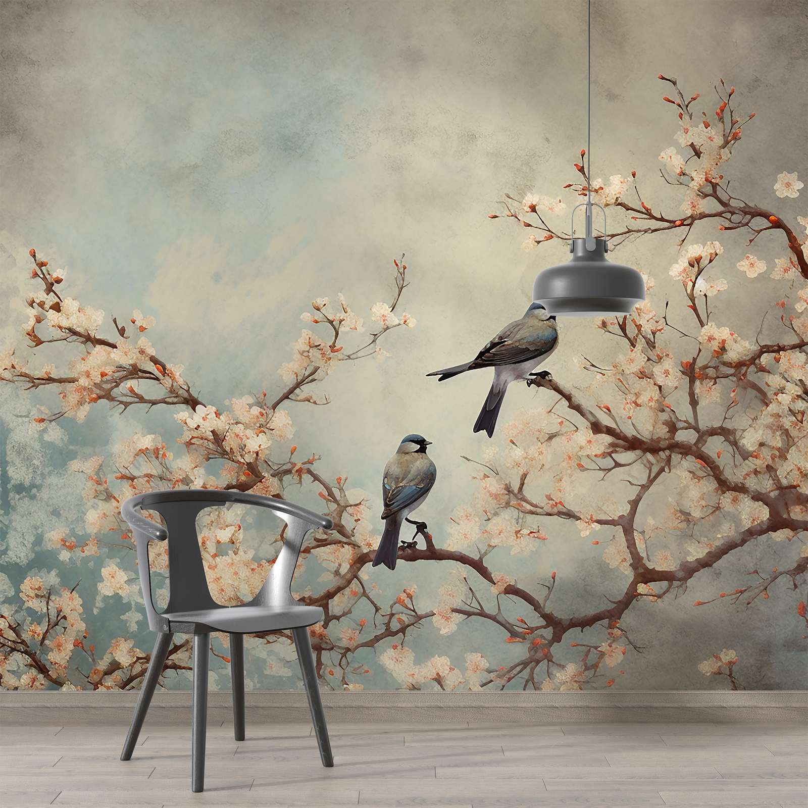 This beautiful wall paper features a serene scene of cherry blossoms with two birds perched on the branches. Perfect for adding a touch of nature and tranquility to your space. The subtle colors and realistic details bring the outside in for a refreshing ambiance. Ideal for any room with a nature-inspired theme.