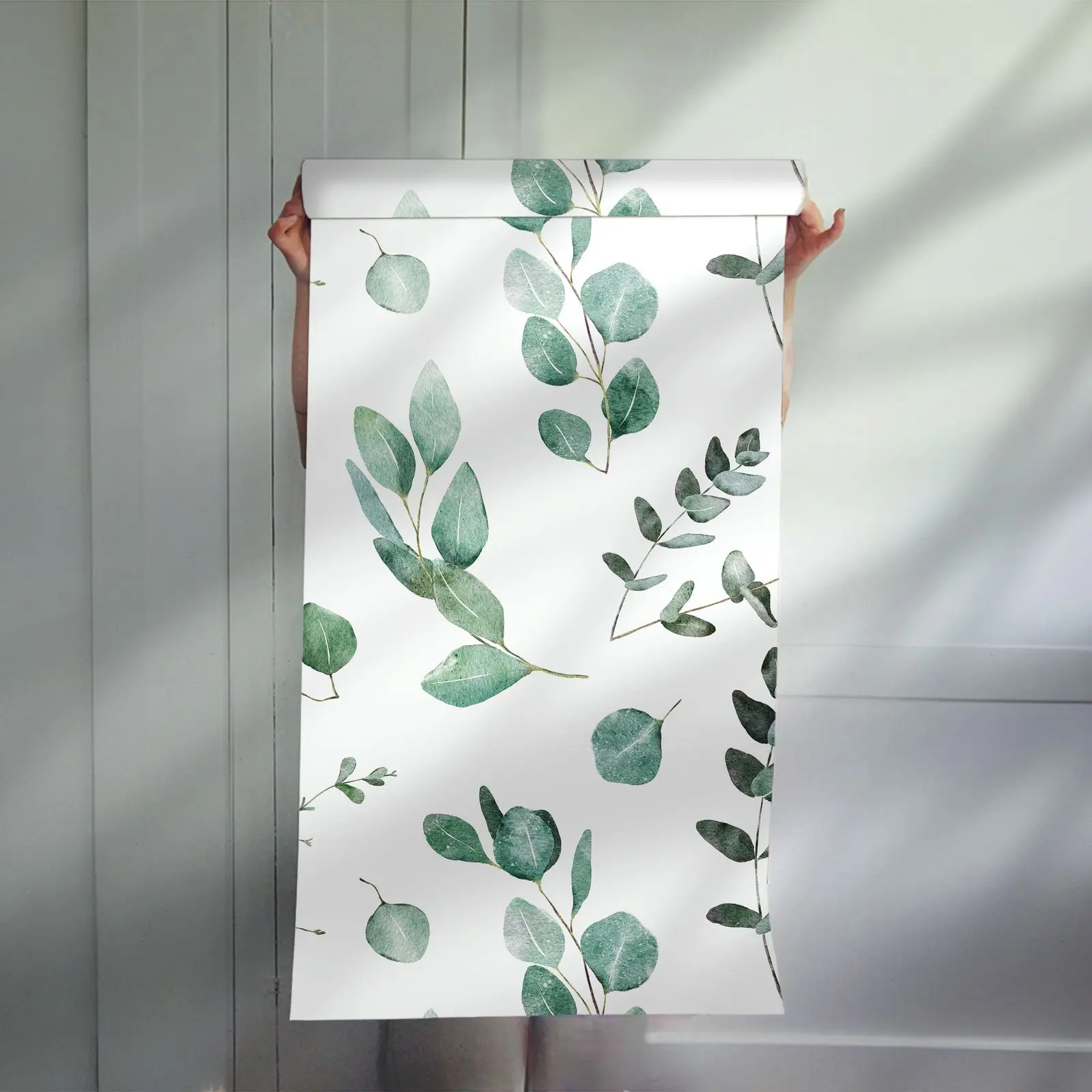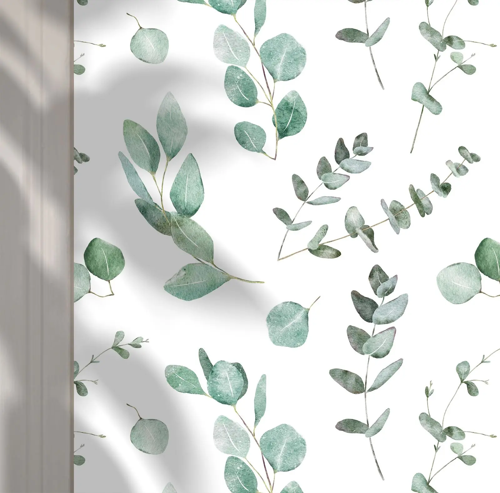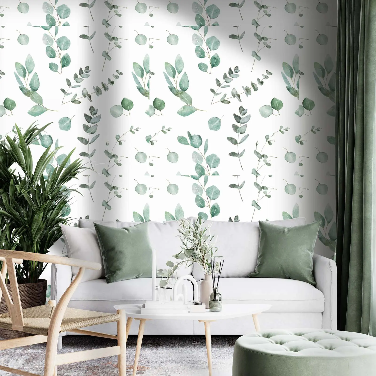This wall paper showcases delicate eucalyptus leaves in a soothing green palette. Perfect for creating a serene atmosphere in any room, this wall paper brings a touch of nature indoors. Transform your space with its calming and elegant design.