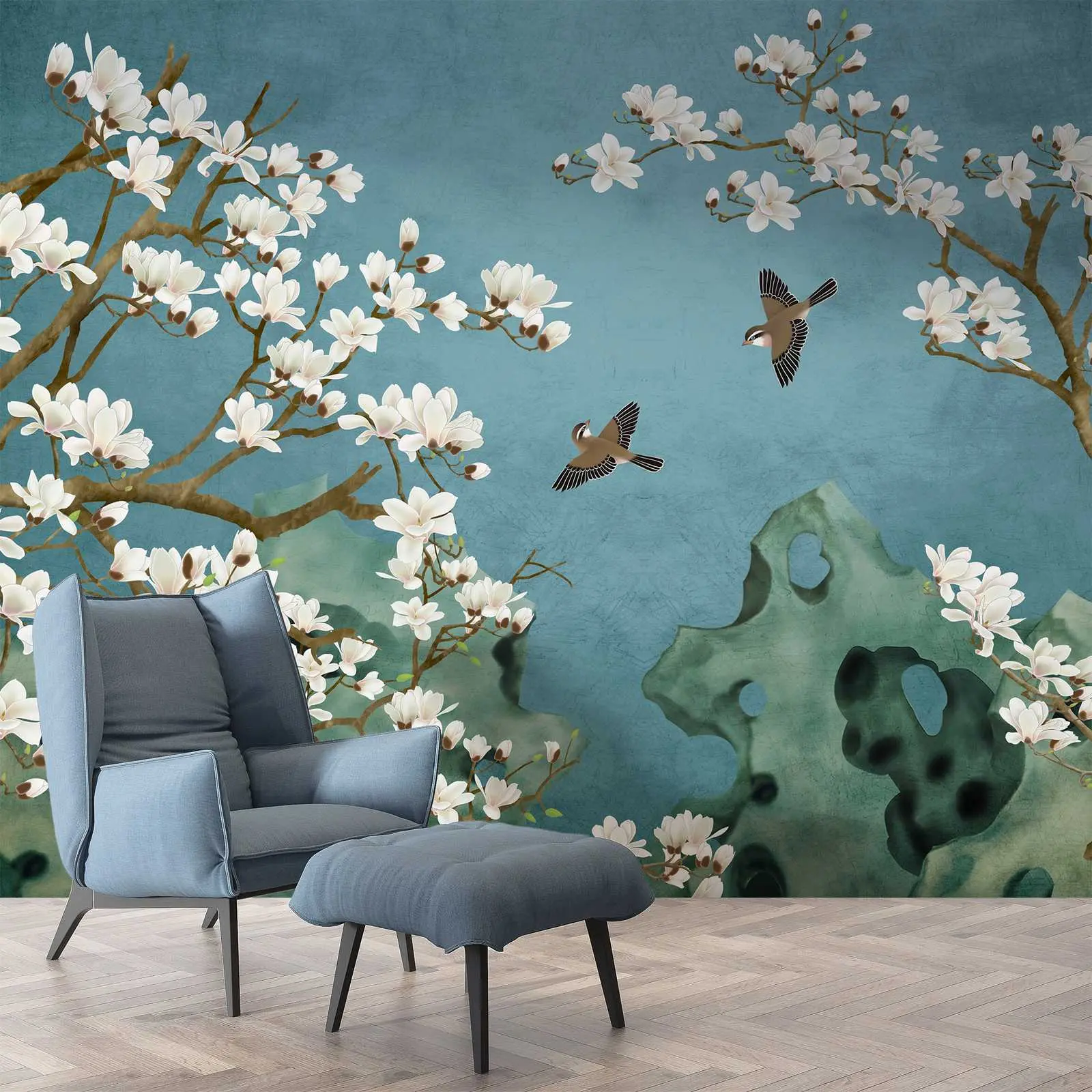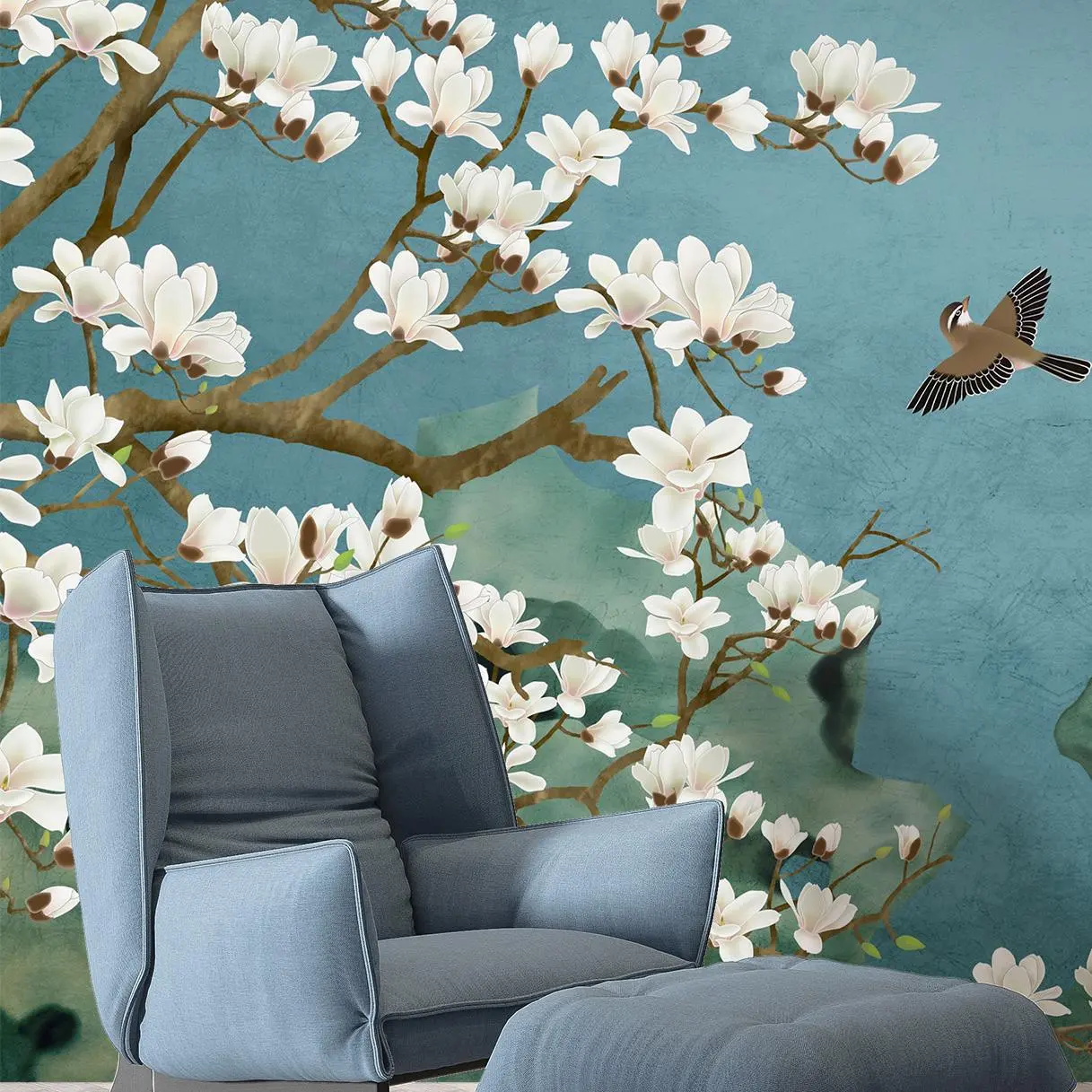 This charming wall paper features a delicate floral magnolia design set against a serene blue backdrop. The arrangement includes two birds, adding a touch of nature and tranquility to any room. Perfect for creating a relaxing and elegant atmosphere. Product contains a single wallpaper only.