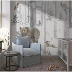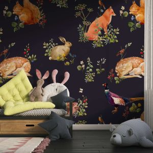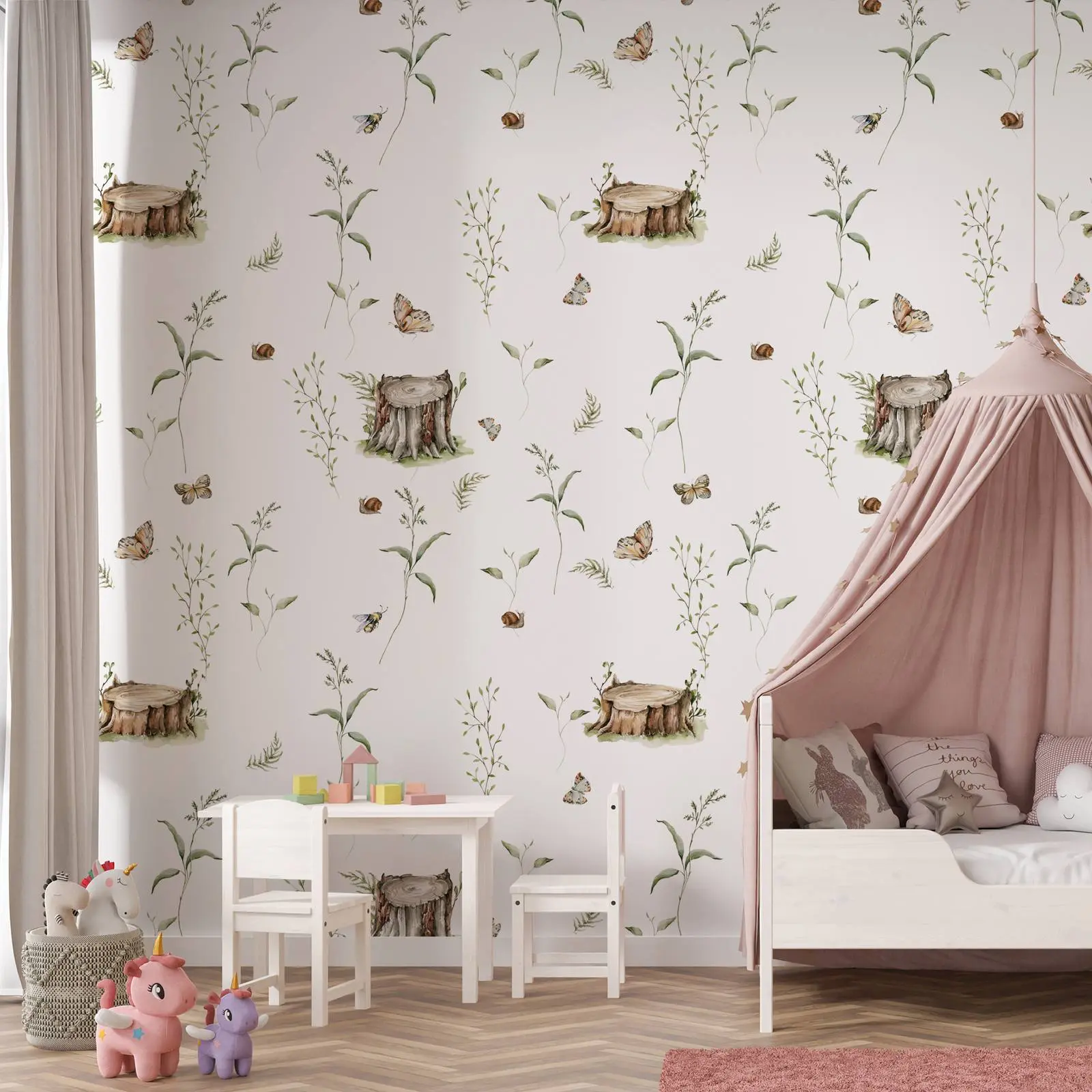This whimsical wallpaper features charming illustrations of forest creatures including butterflies, snails, and tree stumps. Perfect for adding a touch of nature to any room, the design creates a serene and playful atmosphere. Ideal for children's rooms or nature-themed spaces, this wall paper offers a peaceful yet vibrant aesthetic.