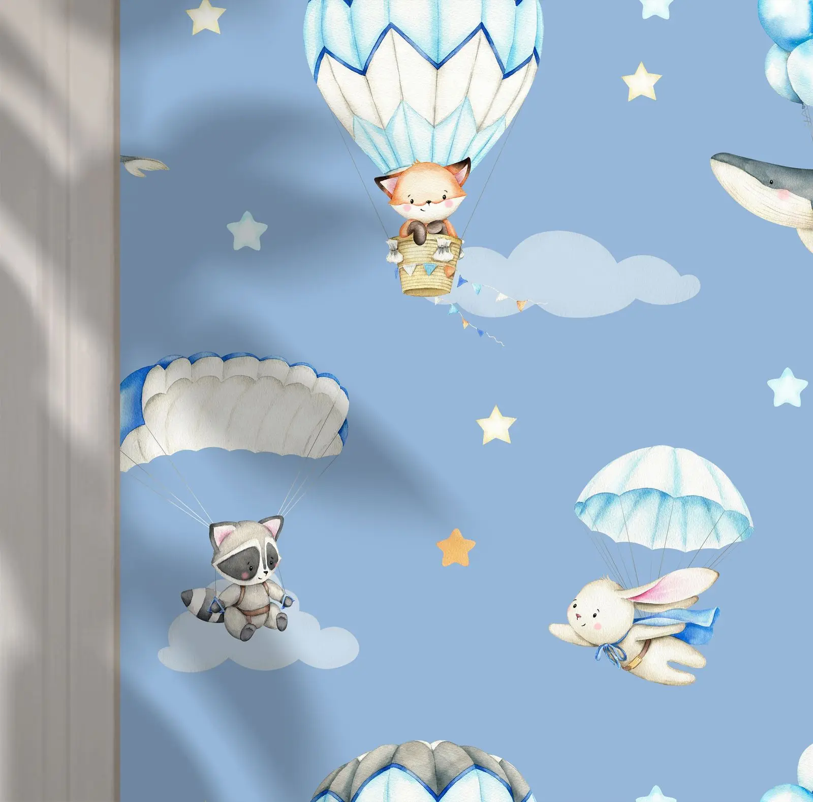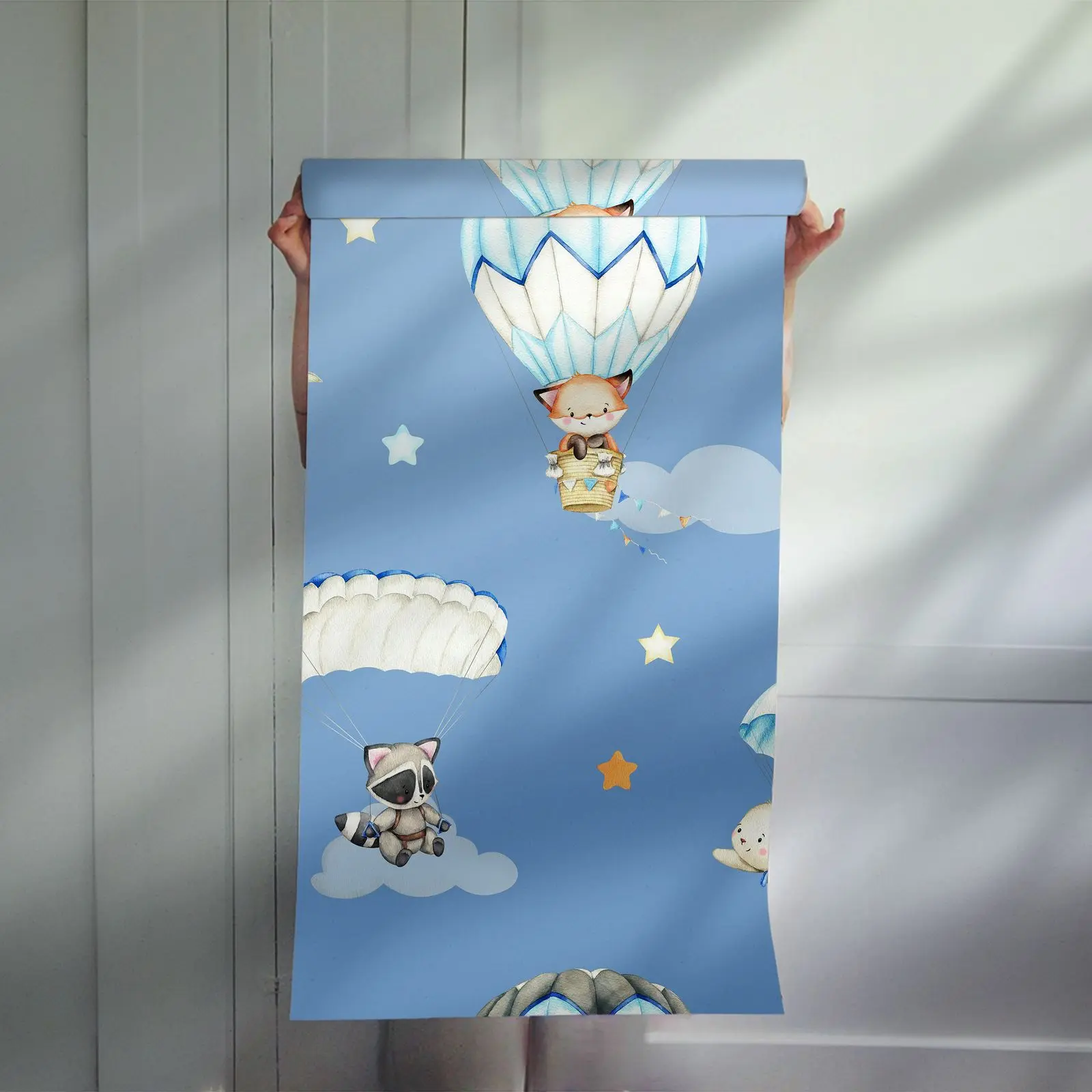 This lovely wall paper features cute animals riding in hot air balloons amid stars and clouds. Perfect for a child's room, it adds a whimsical and adventurous touch. Product includes a single piece of wall paper only.
