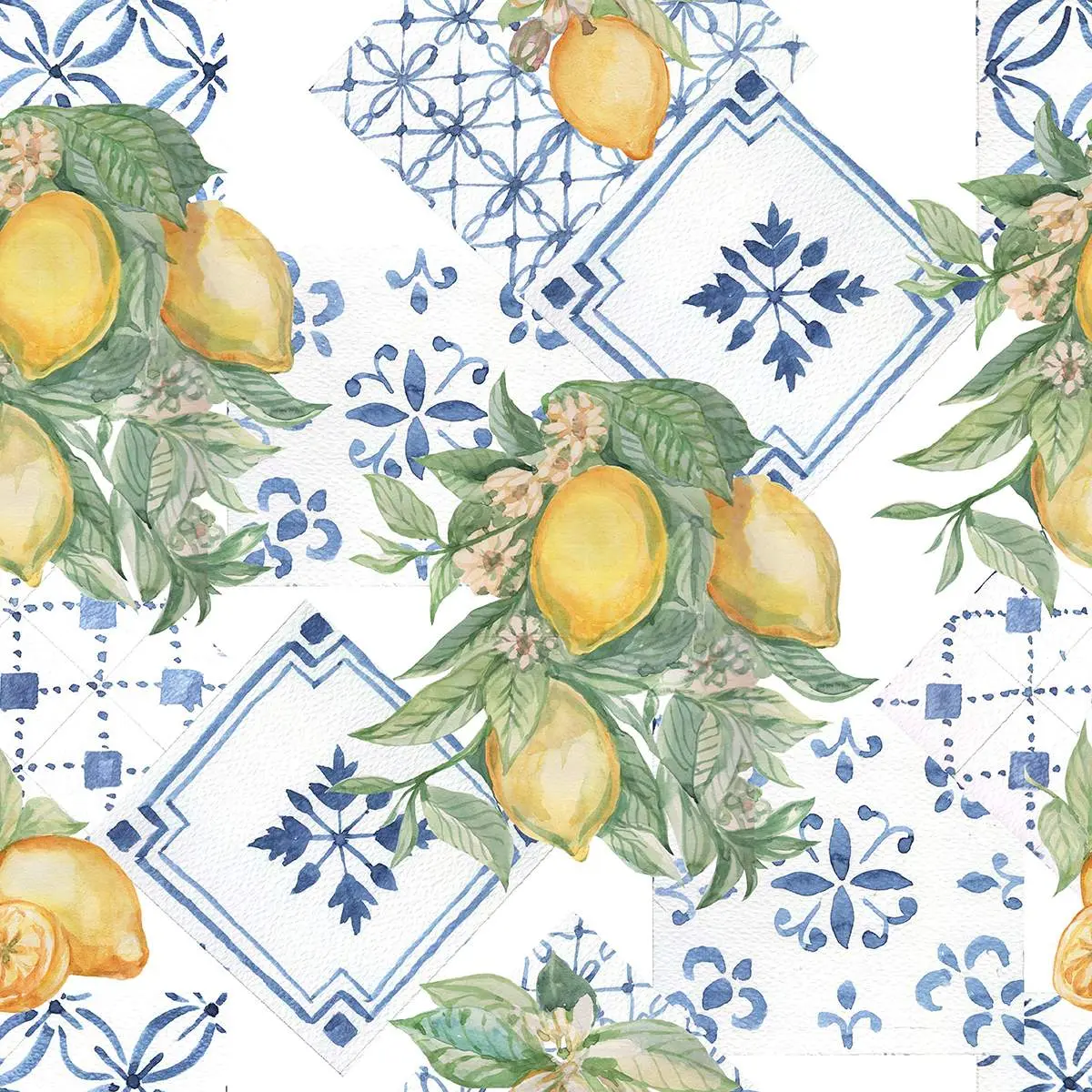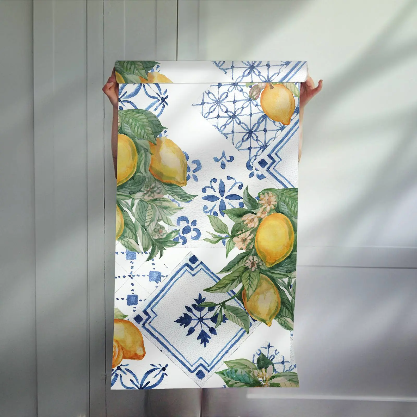 This elegant wall paper features a captivating lemon and floral design with intricate blue accents. Perfect for brightening up any room, it adds a touch of freshness and style. Transform your home with this beautiful wall covering.