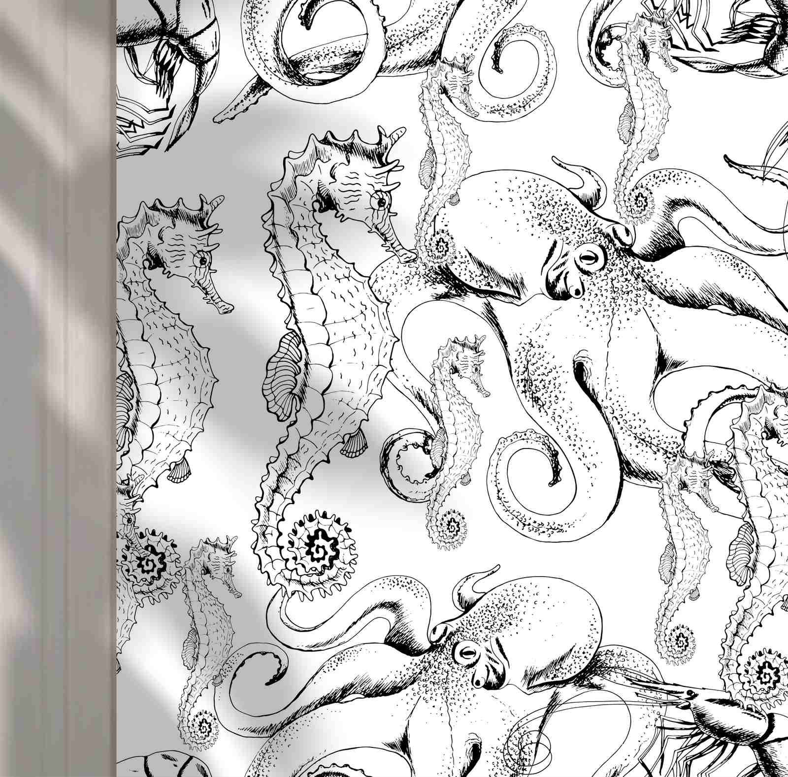 This elegant wall paper features a detailed illustration of ocean creatures, including seahorses and octopuses. Perfect for adding a touch of the sea to any room. Enjoy the serene and captivating marine design. This product contains a single wall paper only.
