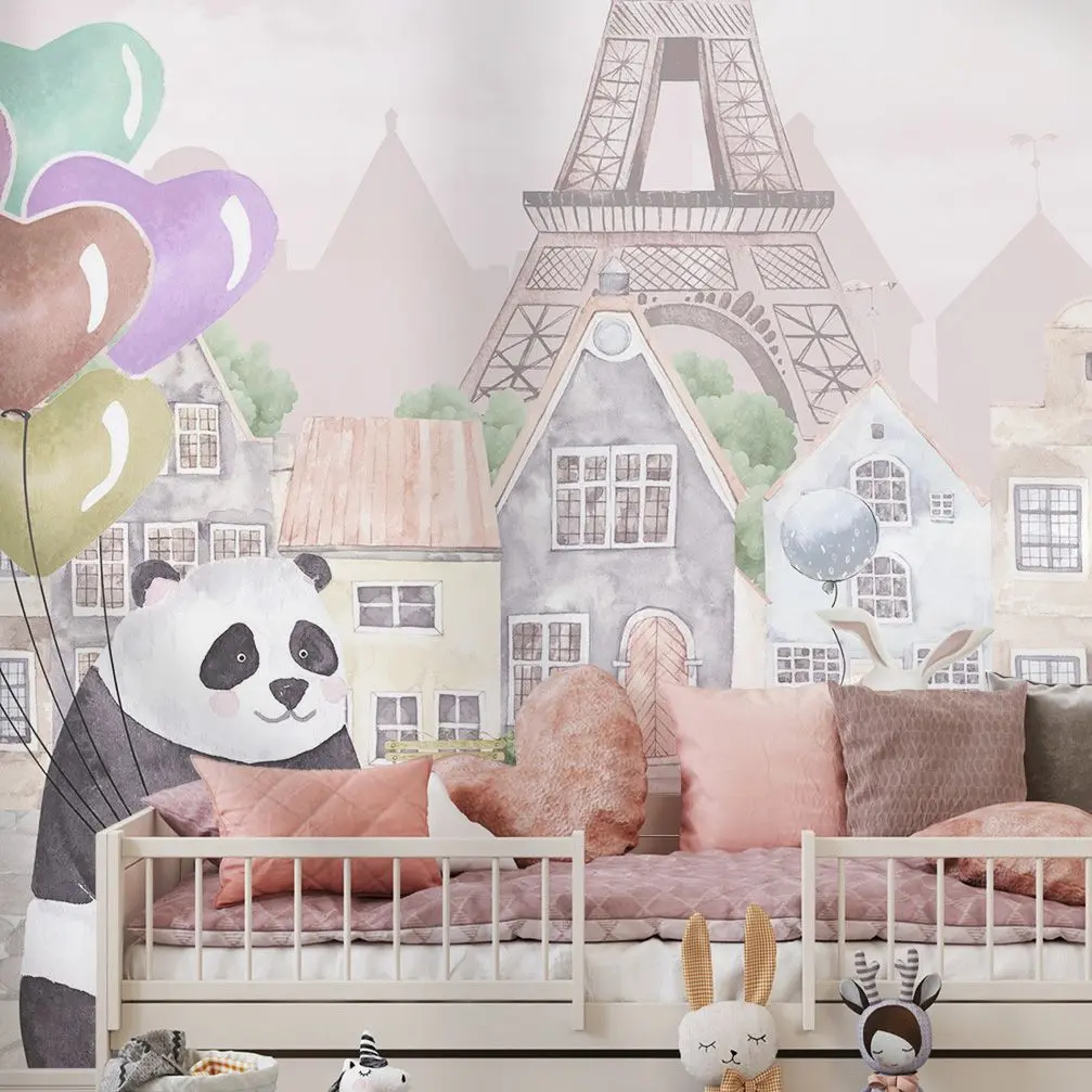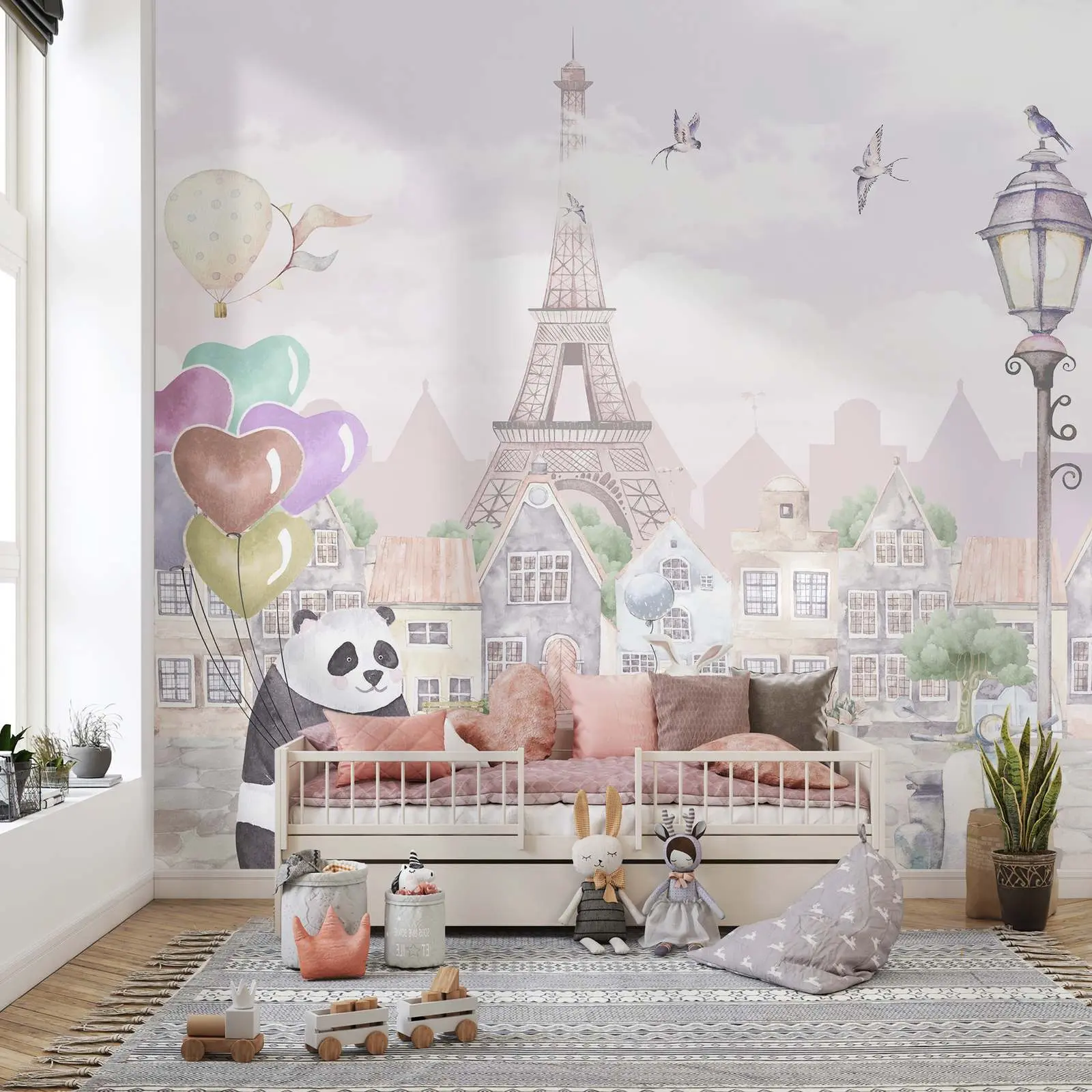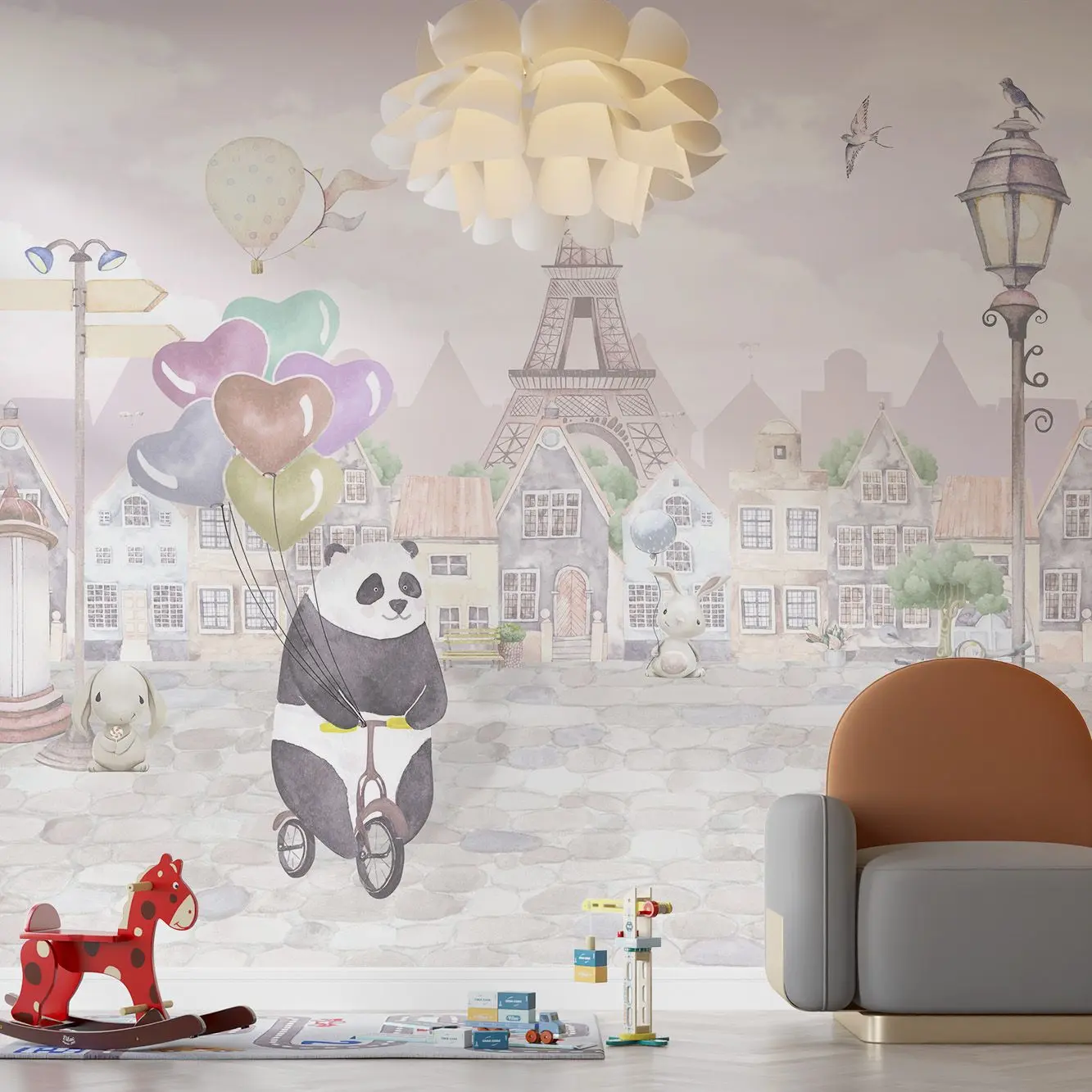 This charming wall paper features an adorable panda riding a scooter among Parisian architecture. The scene includes hot air balloons and birds, adding to its whimsical charm. Perfect for a playful and imaginative room decor, it brings a unique touch to any space.