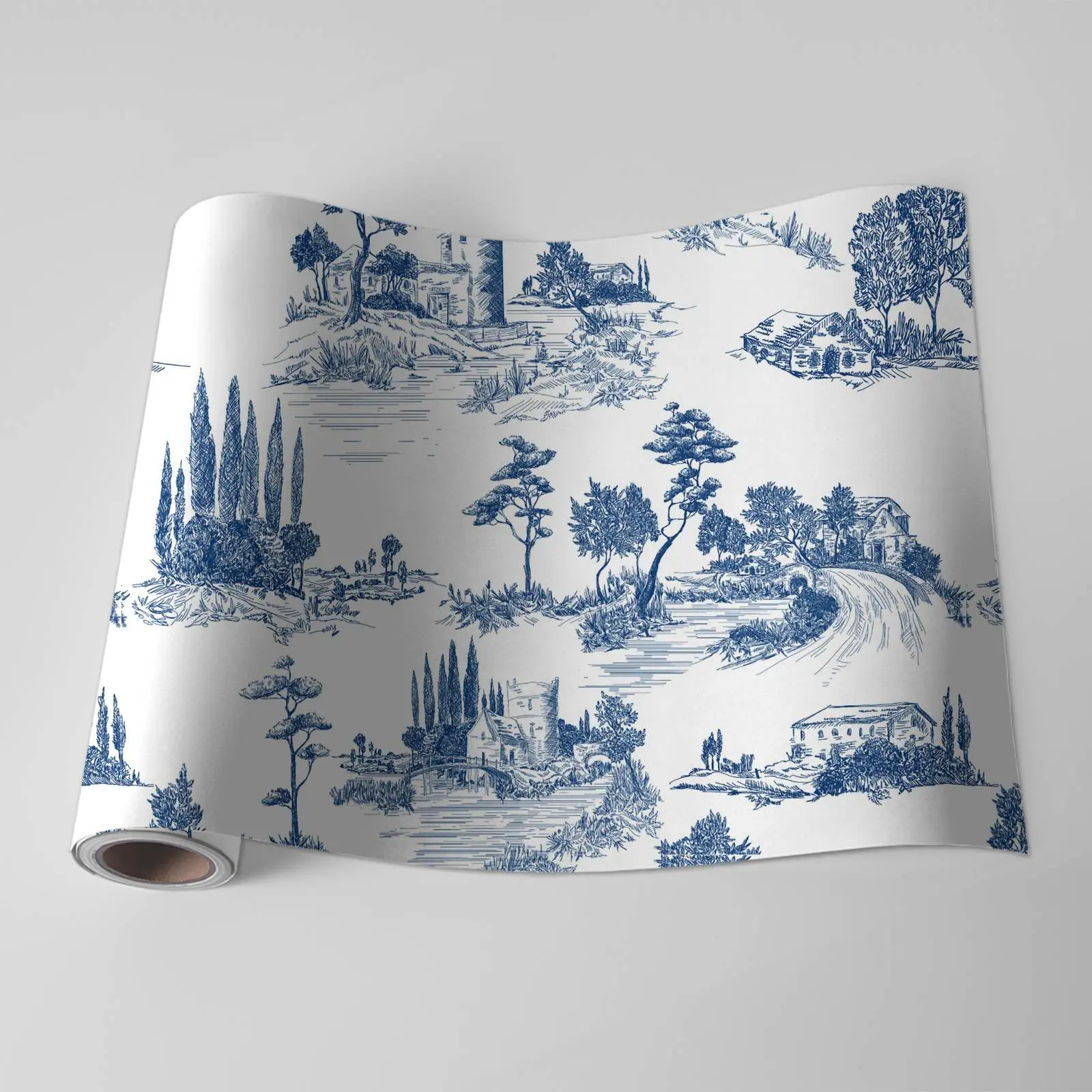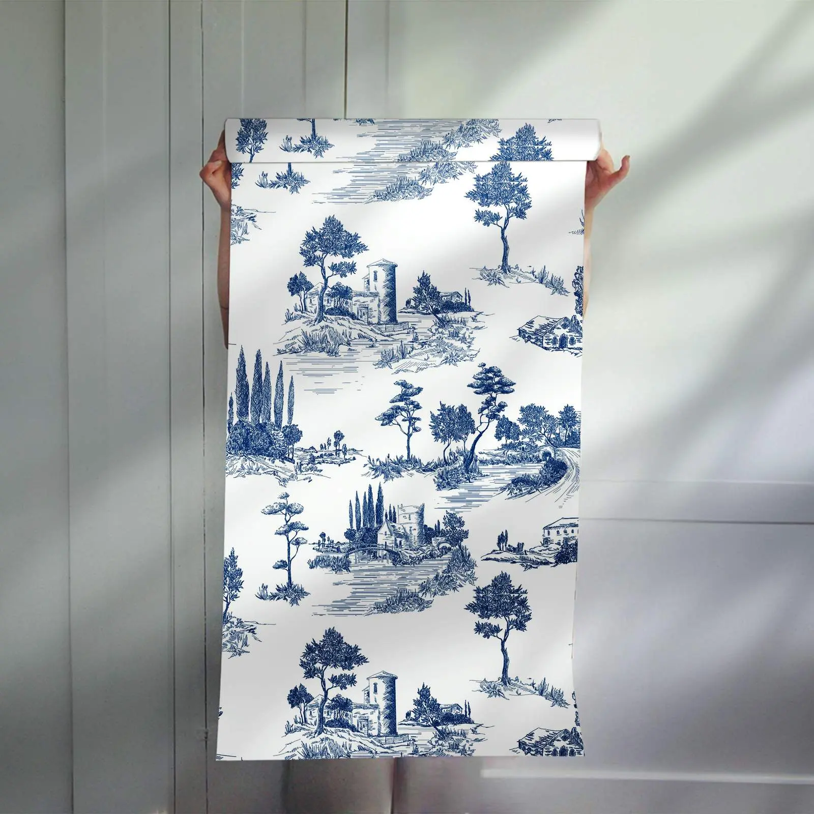 This wall paper features a charming scenic design in blue toile, adding a touch of elegance to any room. The intricate landscapes and historical motifs provide a classic aesthetic, perfect for a sophisticated home interior. Easily installed, this high-quality wall paper enhances the visual appeal of walls. Use it to transform your living space with a timeless, artistic ambiance.