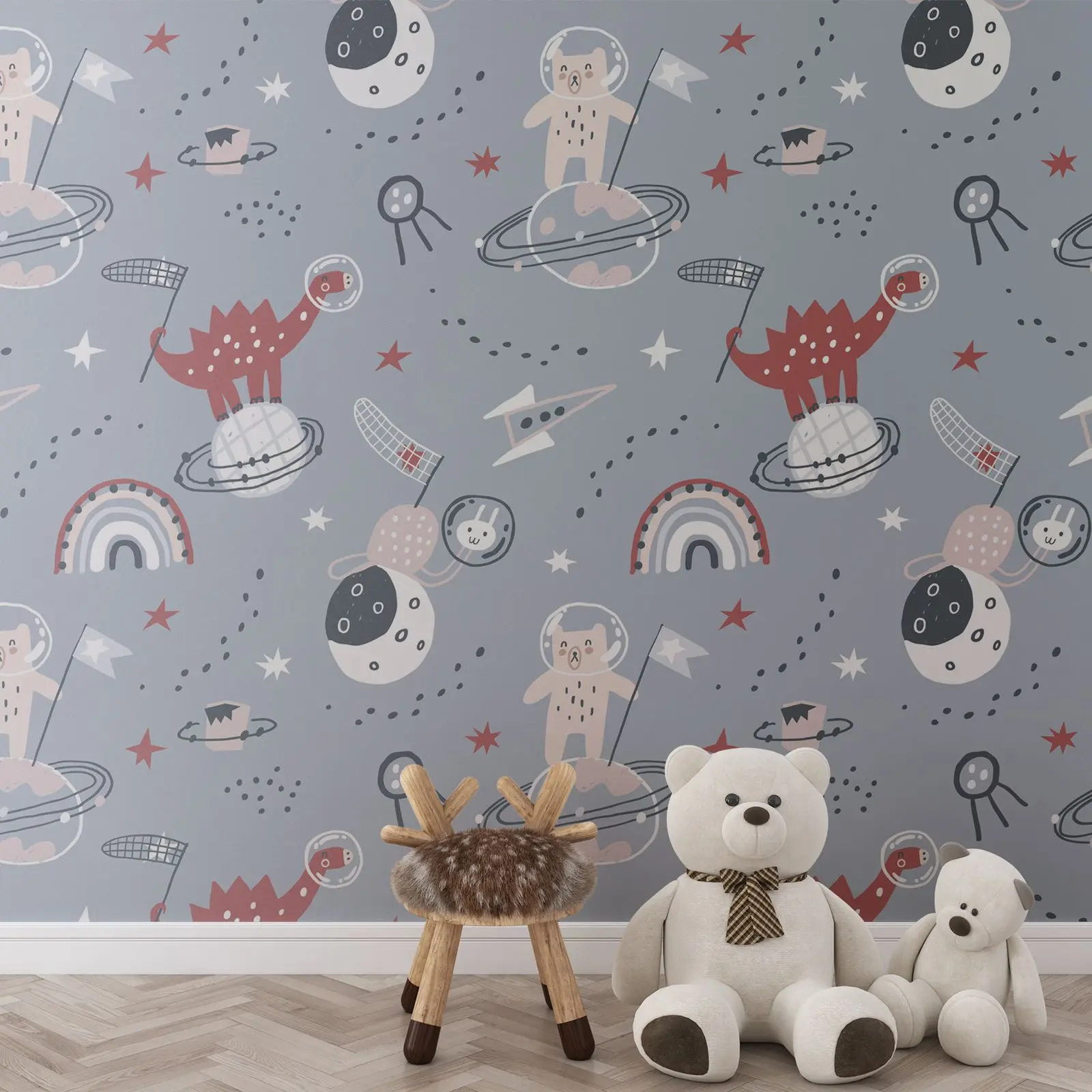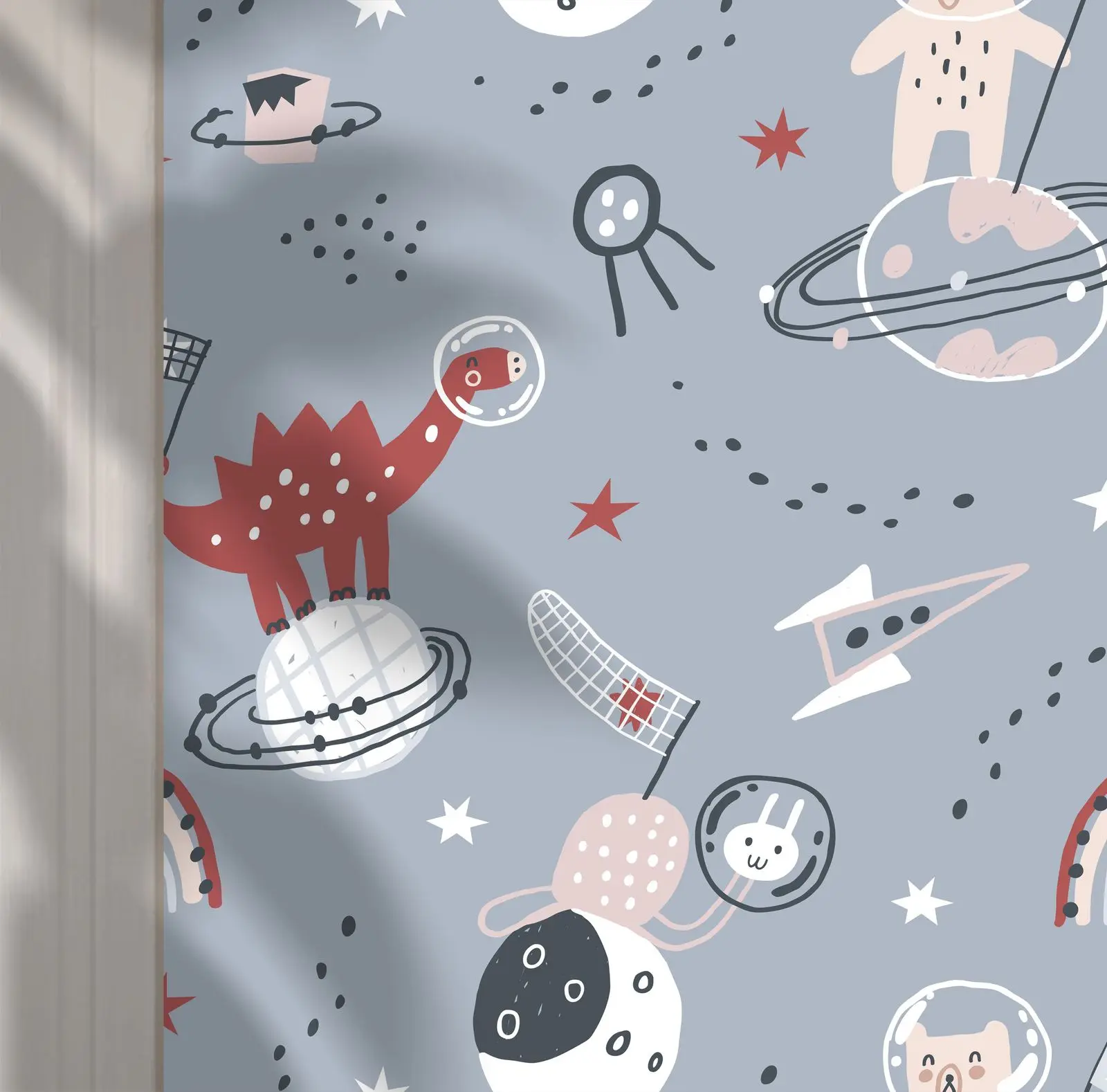 Explore the wonder of outer space with this charming wall paper featuring delightful space creatures embarking on an adventure. Perfect for children's rooms or play areas, this wall paper offers a whimsical touch to any space. Made with high-quality materials to ensure durability and vibrant colors. This product is a single wall paper only.