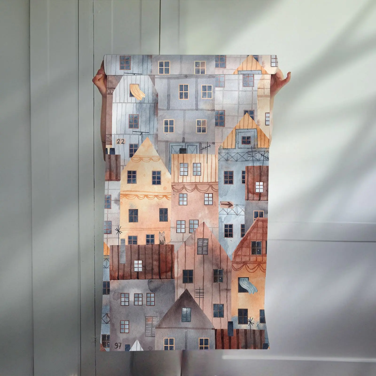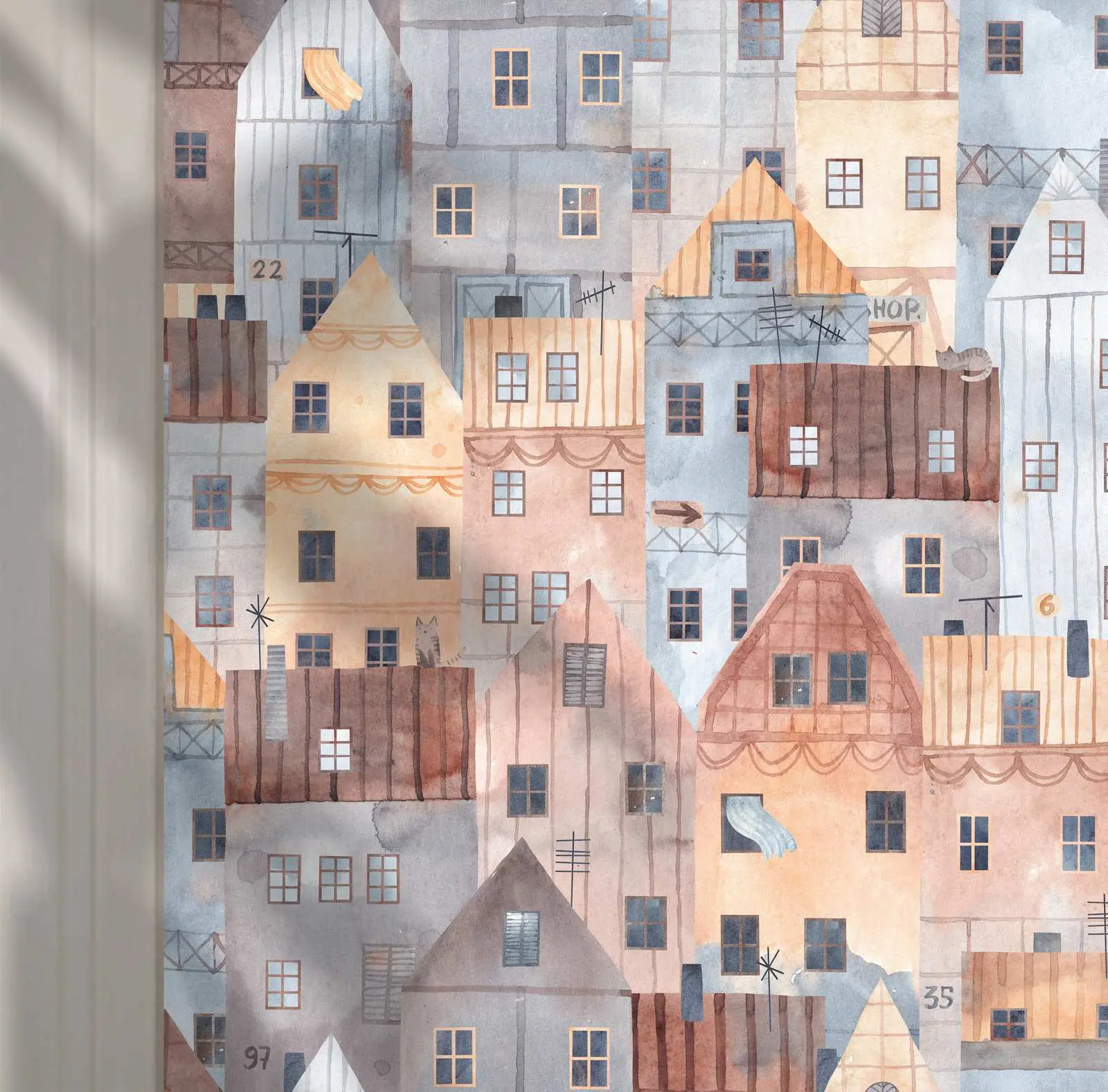 This urban-inspired wall paper features a charming collage of various house facades. Perfect for bringing a touch of city life into your home décor, this design combines muted colors and intricate details. Add character to any room effortlessly with this striking piece. Product contains a single wall paper only.