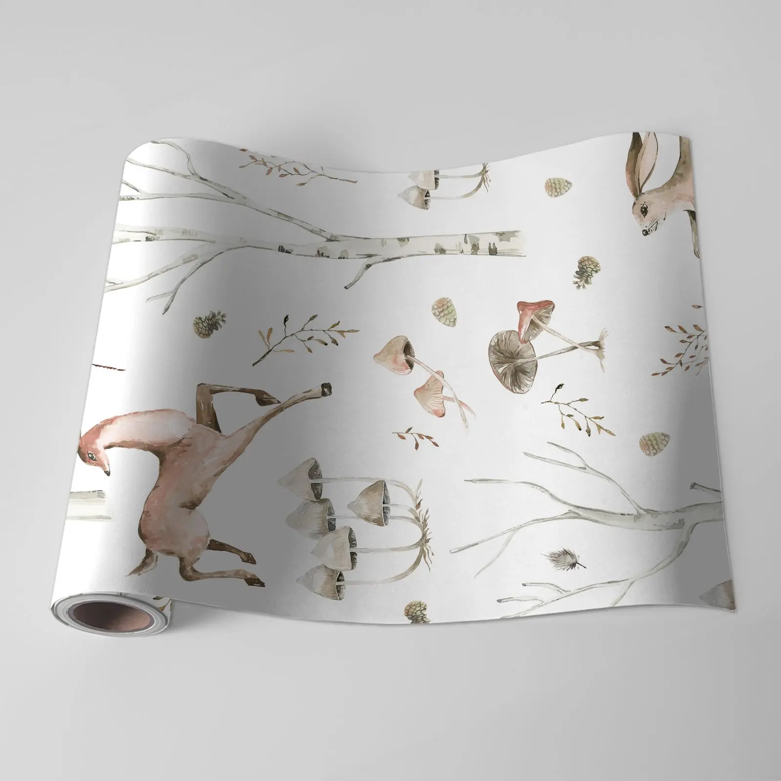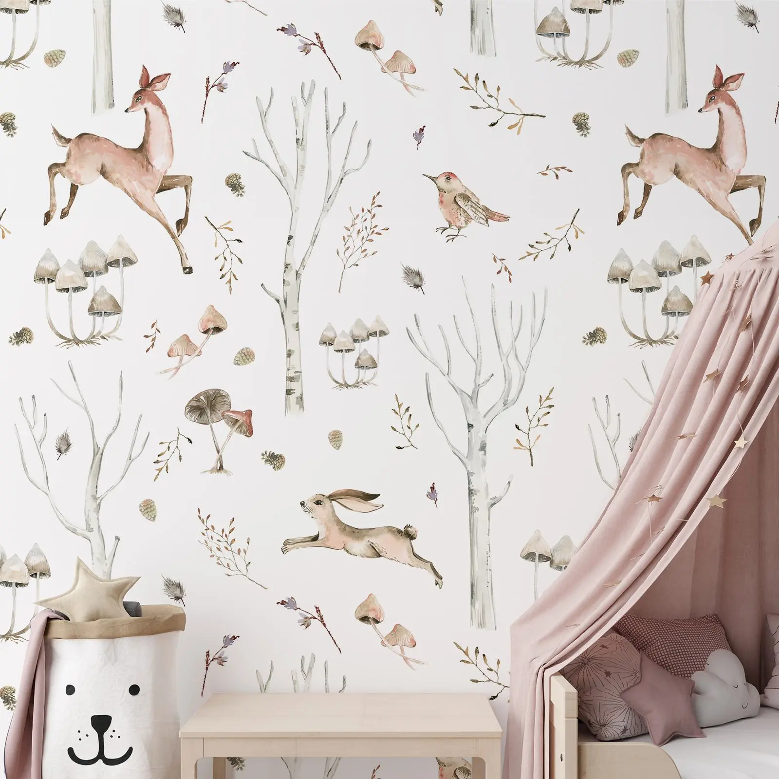 This charming wall paper features whimsical woodland creatures such as deer, rabbits, and birds, set against a backdrop of trees and mushrooms. Ideal for adding a touch of nature to any room. Perfect for nurseries or playrooms. Wall paper provides a nature-inspired ambiance.