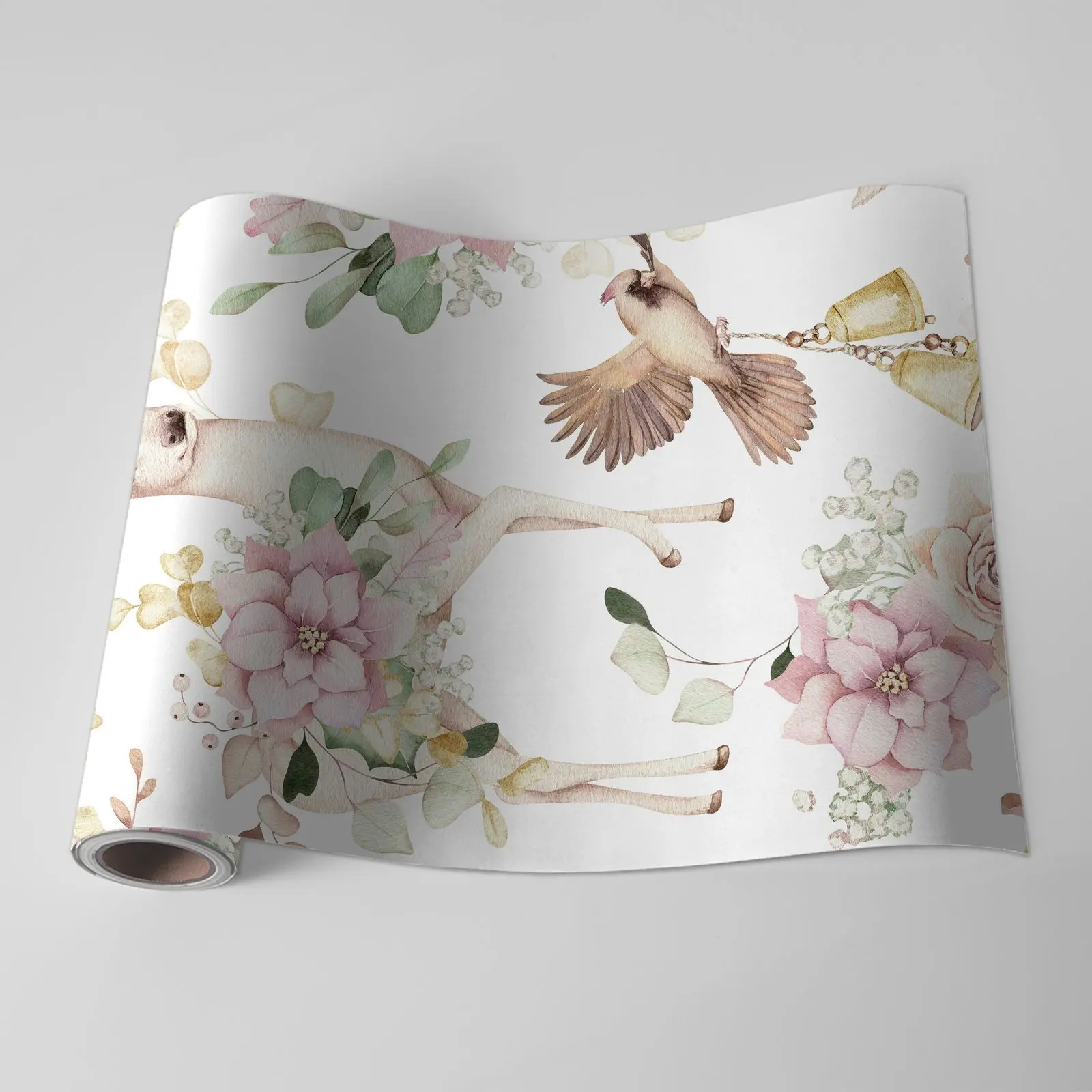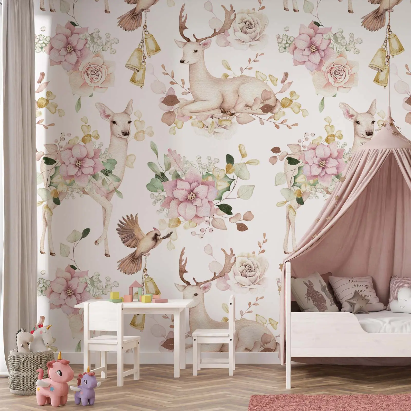 This beautiful wall paper features a delicate floral pattern intertwined with elegant deer and birds, perfect for a serene and enchanting room atmosphere. The artwork showcases graceful deer framed by large blossoms and gentle birds enhancing the overall theme. Perfect for nature lovers and those seeking a touch of elegance in their home decor, this wallpaper adds charm and character to any space.