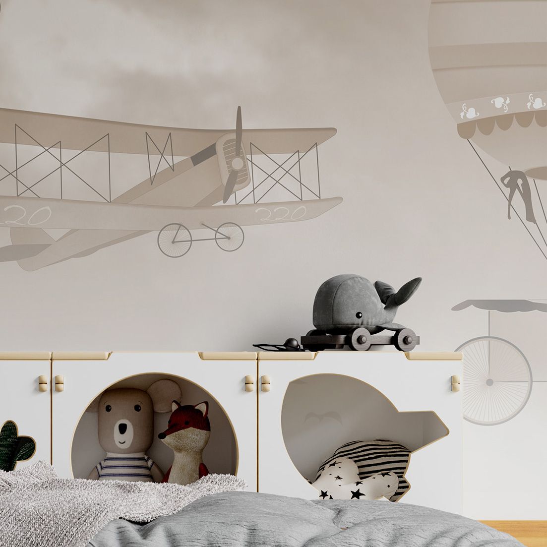 This vintage-inspired wallpaper features whimsical hot air balloons and vintage airplanes, perfect for creating a charming atmosphere in any room. This wall paper transforms your space into a dreamy sky scene complete with soft clouds and soaring birds.